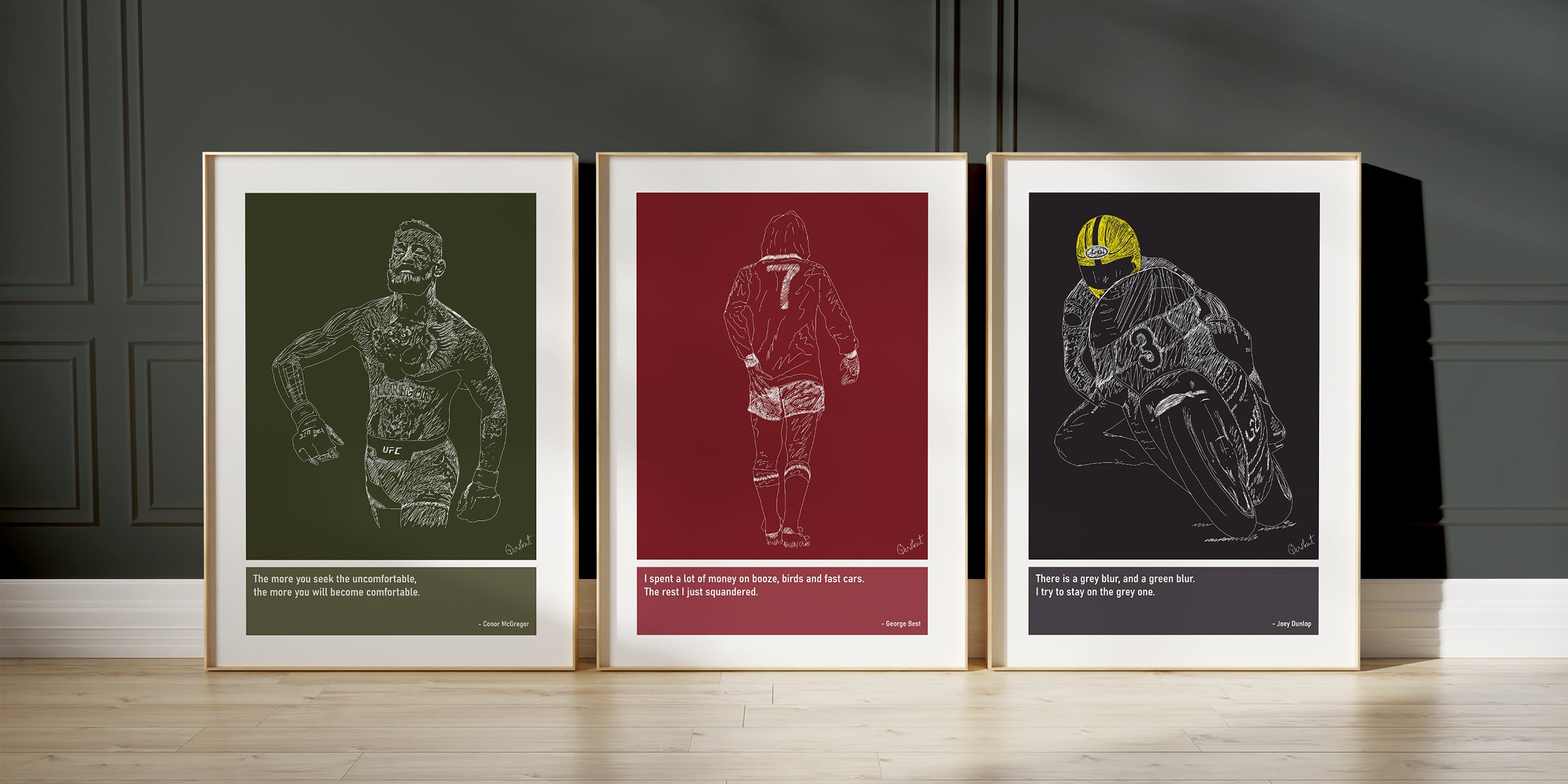 Exclusive sketch art prints of Northern Irish legends including George Best, Joey Dunlop,...